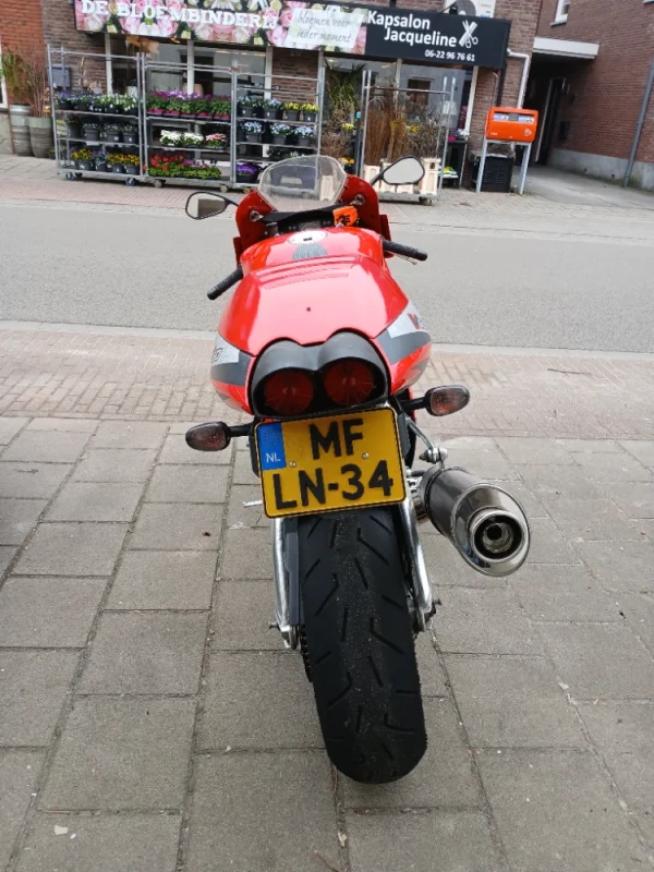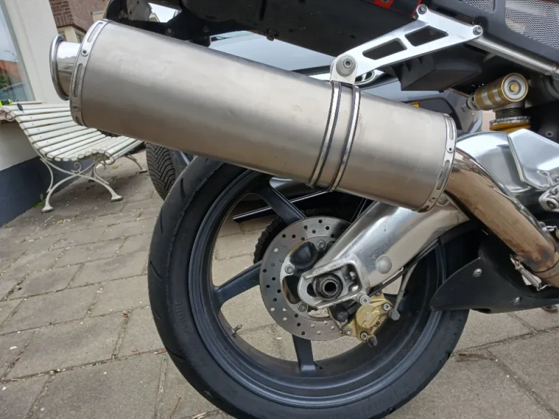 Wegens een ander motorproject moet ik afstand doen van mijn mooie RSV Mille. De motor staat op goede Conti Street Attack 4 banden en stuurt lekker strak. Er zit een klein krasje (3x35mm) rechts op het kuipoor en het deksel van het kontje is overgespoten omdat die bij het opstappen beschadigd geraakt is. De motor heeft nu een originele Aprilia sportuitlaat met bijbehorende Eprom. Standaard uitlaat en Eprom geef ik er bij. Ook is er nog een set ongebruikte duo steunen bij.