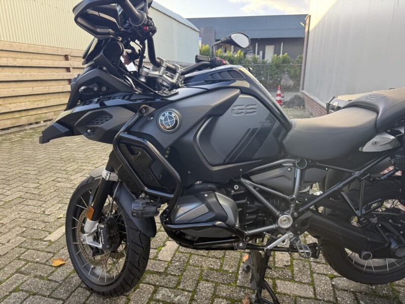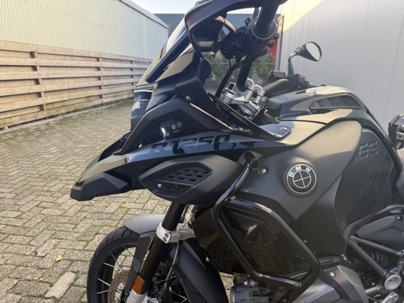 Deze BMW R 1250 GS Adventure uit 2022 is een verschijning die direct respect afdwingt. Uitgevoerd in de geliefde Triple Black kleurstelling, maar dan nóg een stapje exclusiever. De vorige eigenaar heeft namelijk oog voor detail gehad: de valbeugels, koffers en het windscherm zijn volledig in het zwart uitgevoerd. Dit geeft de motor een unieke, "stealth" look die je zelden ziet.
