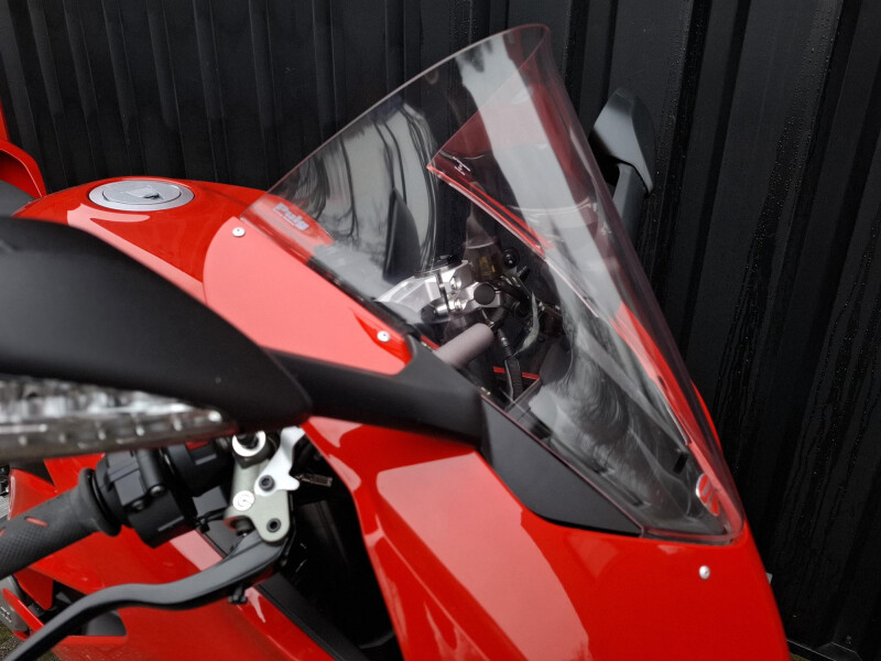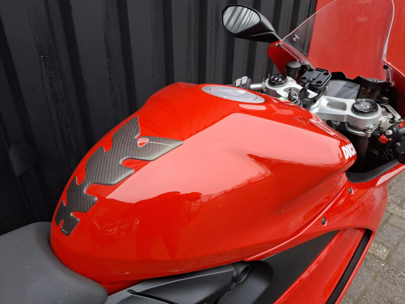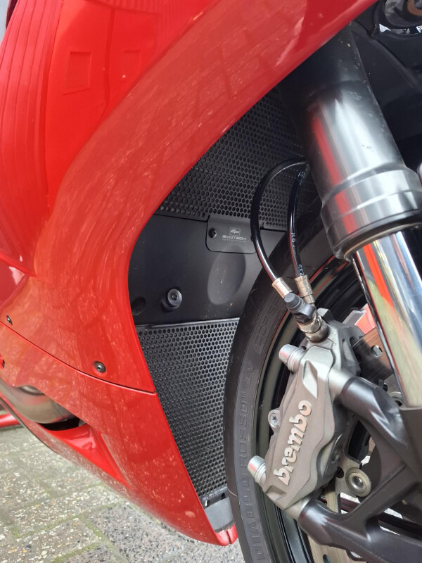 De Panigale is voorzien van een Hoge kuip ruit, Rode Mono posto seat cover, Evotech korte kentekenplaathouder, Evotech radiatorbescherming, Evotech garmin navi houder, Progrip handvaten en Ducati tankpad.