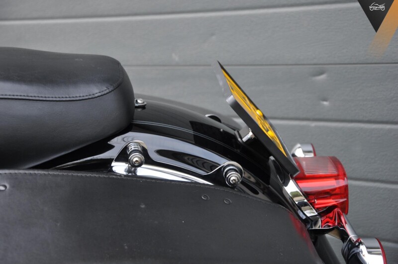 Geen hele berg extra's maar wel uitlaten van Rhinehart beugels en spiegels zwart uitgevoerd, dockingkit voor een sissybar, kentekenplaat schuin gezet, witte knipperlichtglazen voor, rode achter en dat was het wel zo'n beetje!
