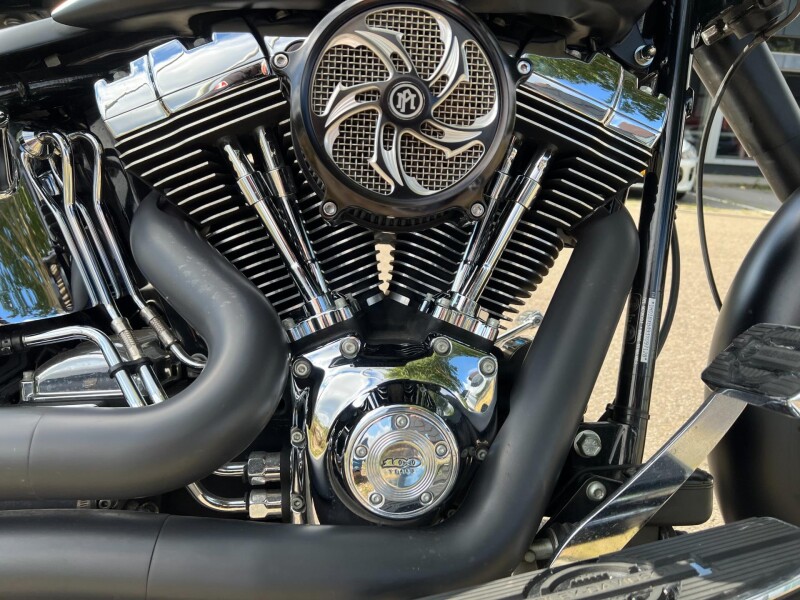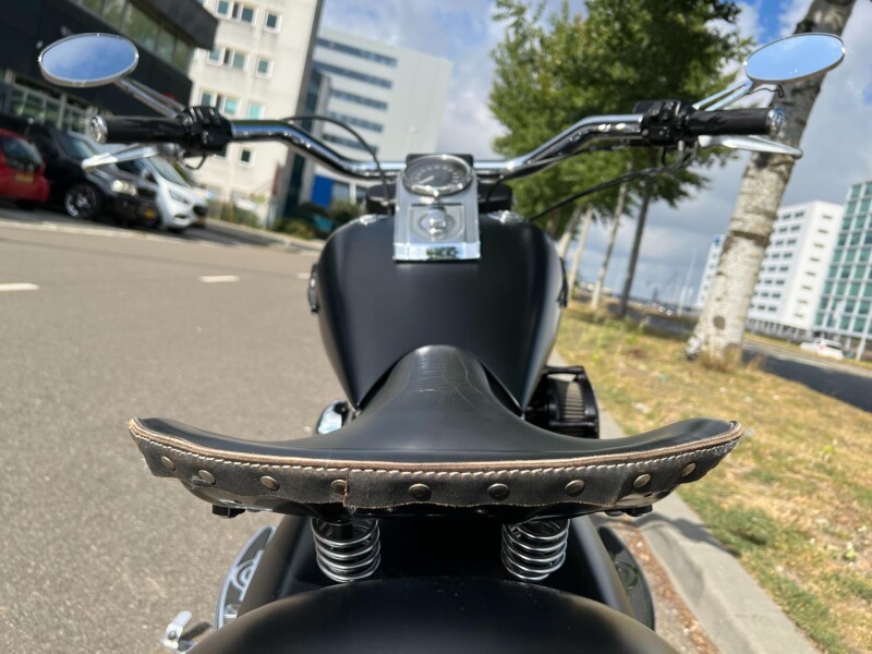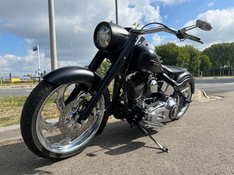 Super dikke omgebouwde customized Fatboy Anniversary . solo uitgevoerd met lederen zweefzadel. Stretched tank met verzonken Skull-tankdoppen. De motor is verbouwd bij South-East Motorcycles. Een Super bike om te zien en mee te rijden.
