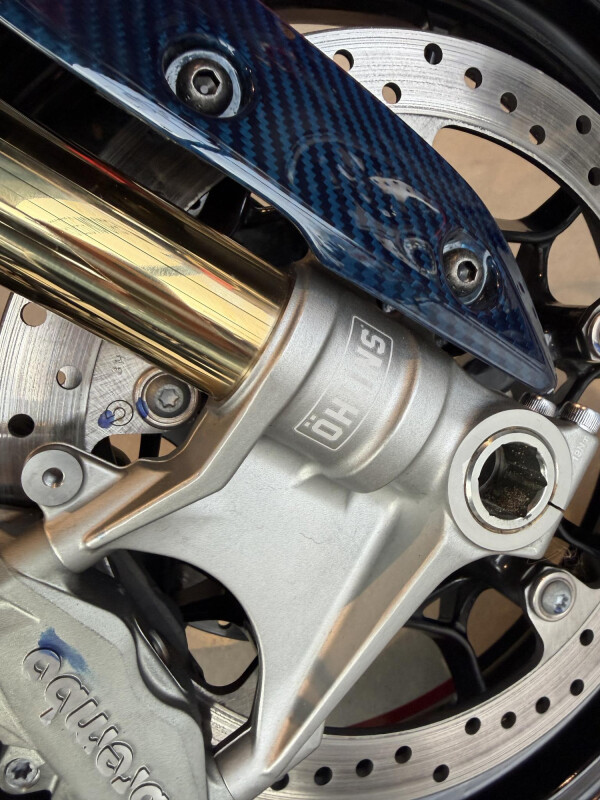 De carbon benzinetank, kontje en voorspatbord zijn allemaal gespoten in het Candy Blue. Het witte frame steekt daar mooi tegen af. De Öhlins voorvork is niet langer goud, maar zwart en hetzelfde geldt voor de monoshockdemper. Ook de uitlaatdemper van Akrapovič is uitgevoerd in zwart.