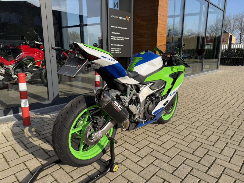 Deze nog in nieuwstaat verkerende Kawasaki ZX4RR Anniversary Edition van S origineel Nederlands geleverd en van de 1ste eigenaar. Hij is compleet Dealer onderhouden en heeft zowel in 1.000 km beurt gehad en zijn jaarservice bij 3.385 KM( facturen aanwezig). Verder is hij voorzien van een SC Projects carbon demper, korte kentekenplaathouder en kleine knipperlichten..geheel rijklaar in de mooiste kleur stelling!