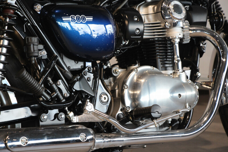 Het motorblok is met zijn lange slag afgesteld om te presteren in het lage en middelhoge toerengebied, levert veel koppel en een gevoel van soepel vermogen. Het rijke motorkarakter herinnert de rijders eraan dat ze een unieke Twin Motor besturen. In tegenstelling tot de overwegend zwarte motorblokken van de W800 STREET en CAFE, is de motor van de W800 overwegend Briljant Silver, deze afwijkende kleur onderstreept de klassieke vormen en inherente schoonheid van het motorblok.