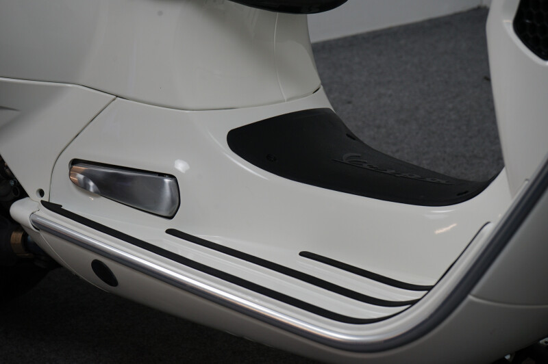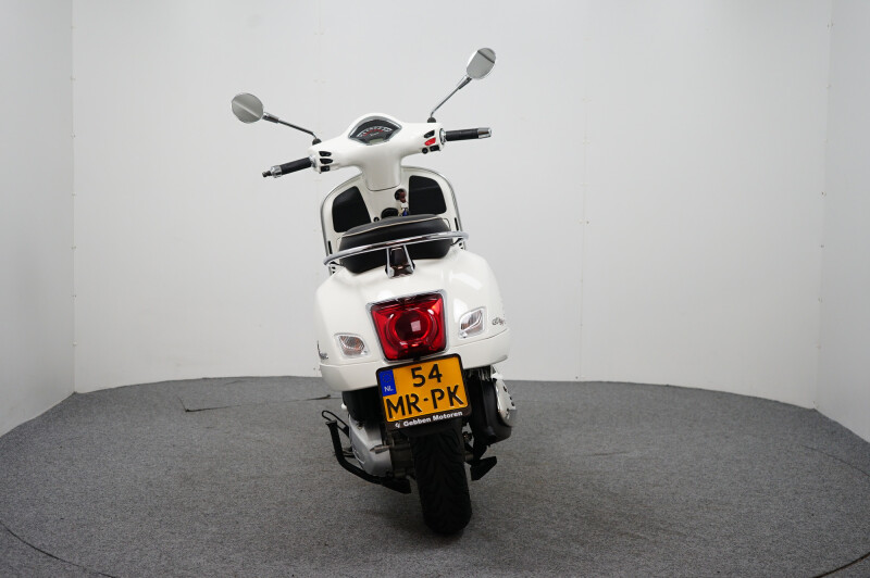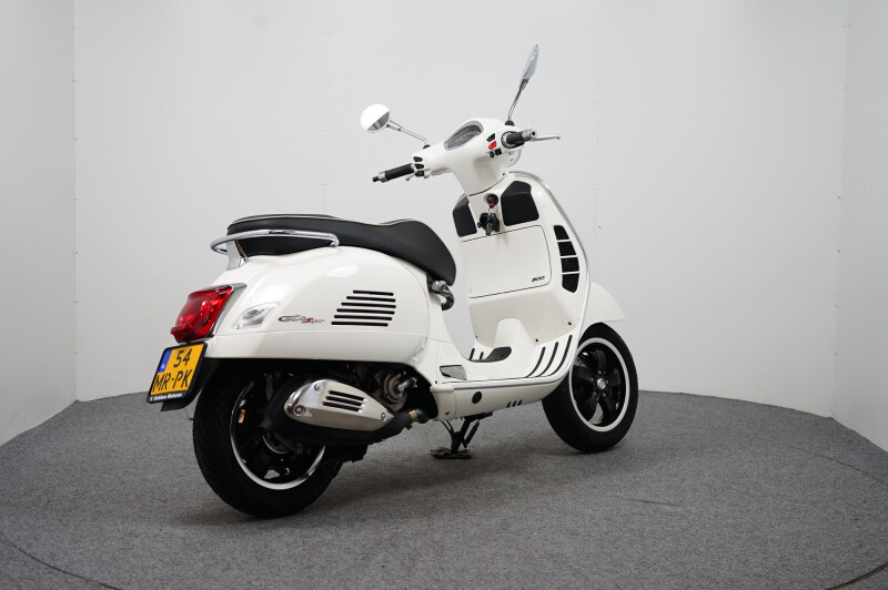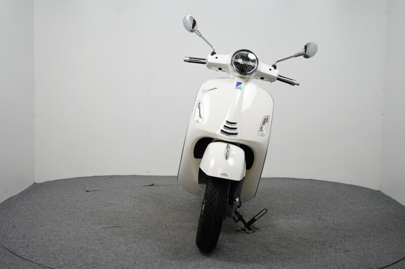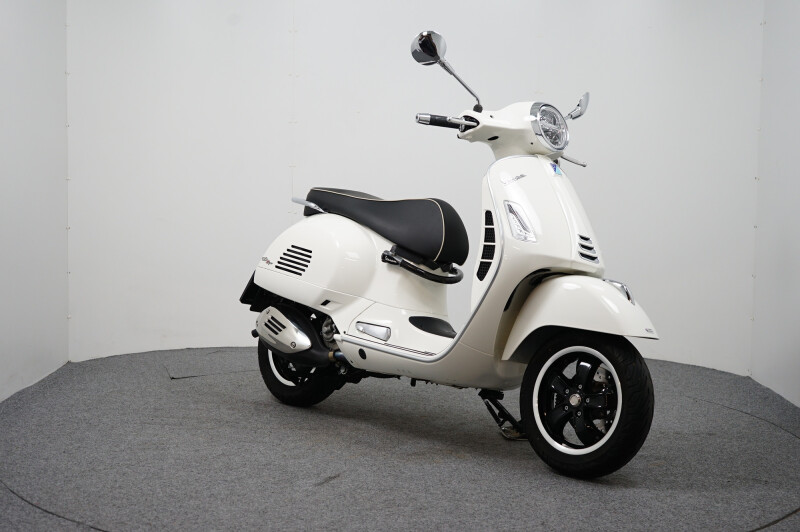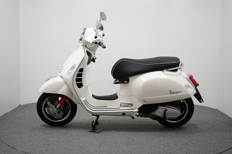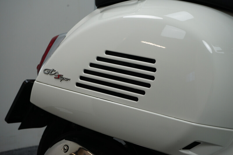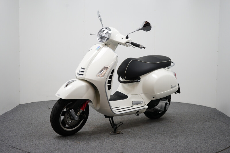 IN NIEUWSTAAT VERKERENDE VESPA GTS 300 HPE IN DE KLEUR WIT.