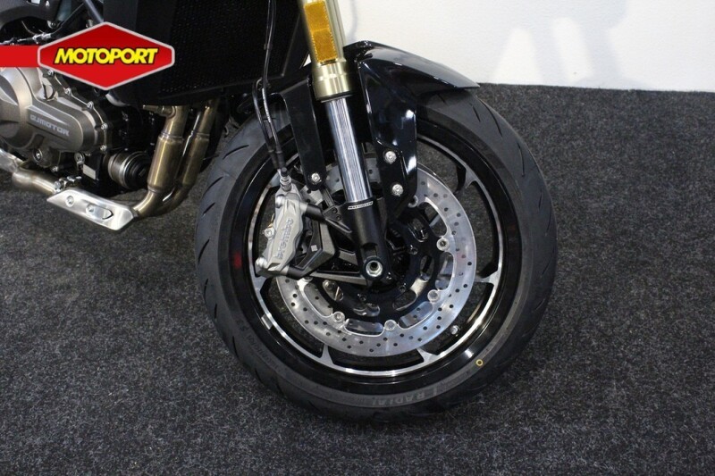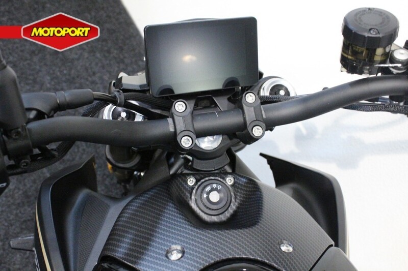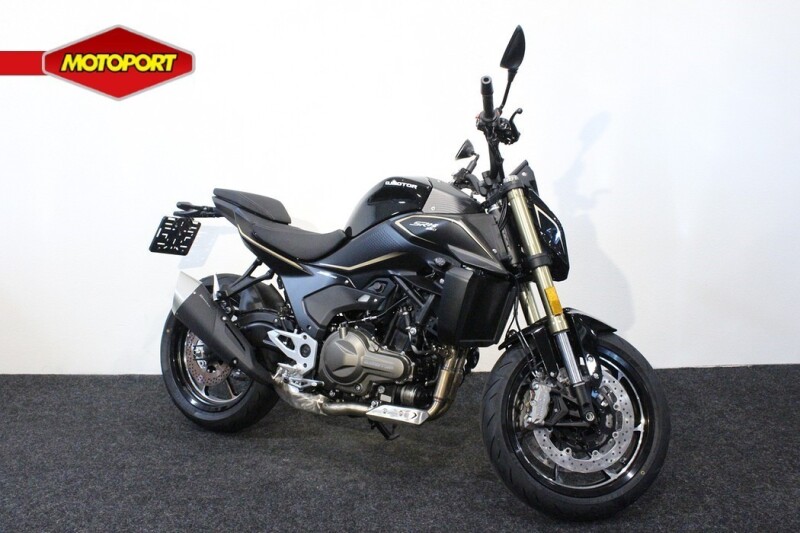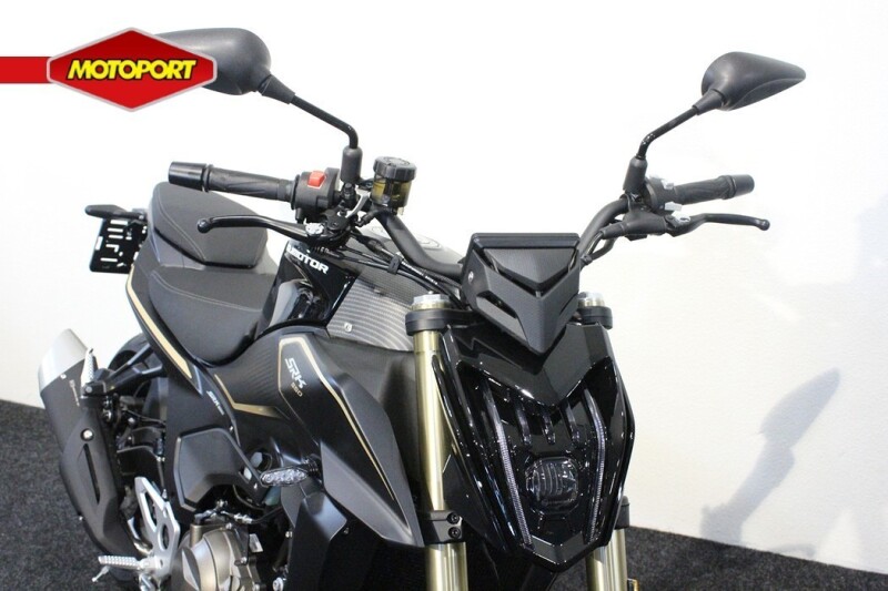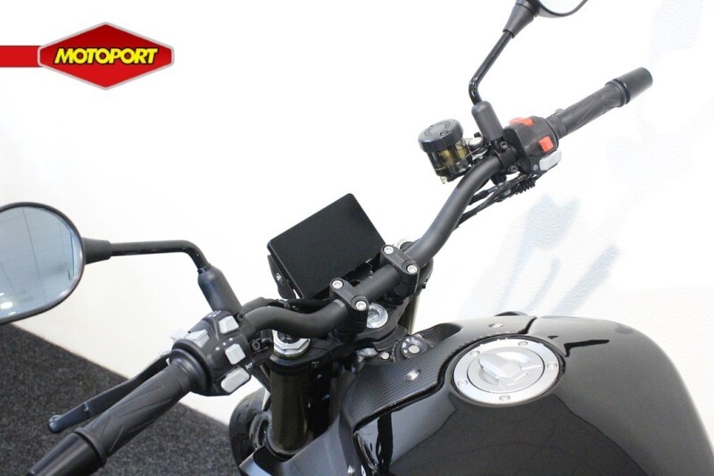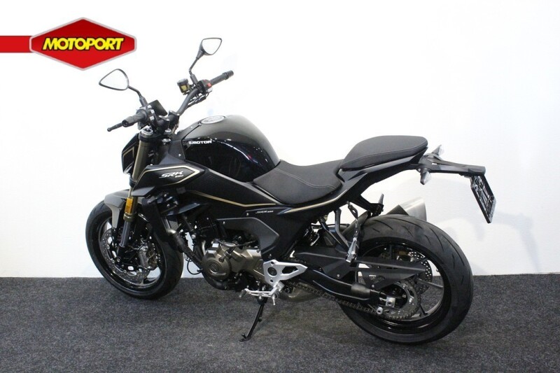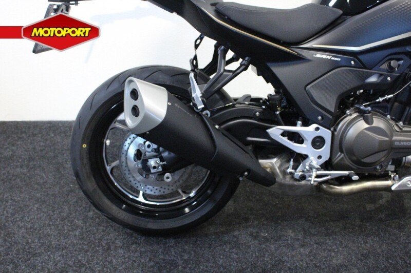 De motorfiets heeft een sportief en strak design, met scherpe lijnen en moderne accenten die hem een eigentijdse uitstraling geven.
