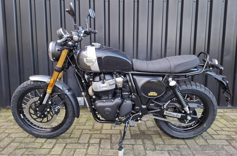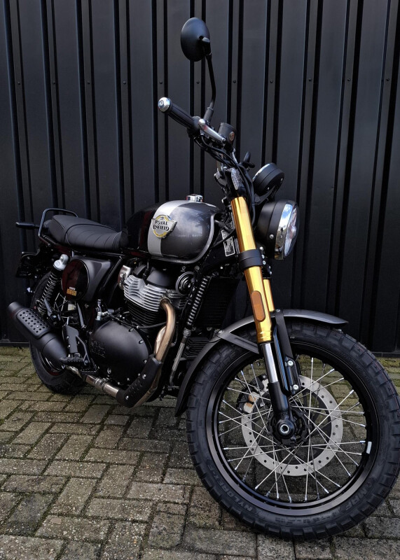 Maak kennis met de Royal Enfield Bear 650, een motorfiets die retro charme en moderne kracht combineert. Gebaseerd op de Interceptor 650, is deze scrambler geïnspireerd door de iconische overwinning van Eddie Mulder tijdens de Big Bear Run van 1960. Met een opvallend scrambler-ontwerp, een 650 cc parallelle tweecilindermotor, en indrukwekkende bodemvrijheid van 184 mm, staat deze motor voor avontuur, stijl en kracht.