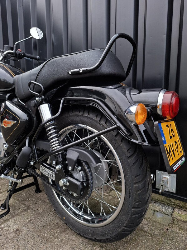 Royal Enfield Bullet 350, afkomstig van de eerste eigenaar en Nederlands geleverd. Deze stijlvolle Bullet is uitgevoerd in zwart met gouden accenten, wat zorgt voor een tijdloze en klassieke uitstraling.