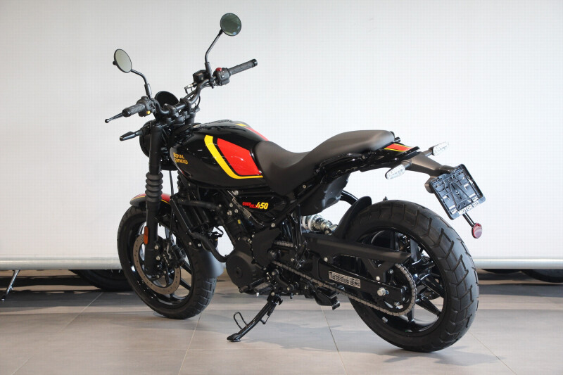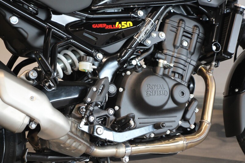 De krachtbron van de Guerrilla 450 is de geavanceerde nieuwe vloeistofgekoelde 452 cc Sherpa-ééncilindermotor ontwikkeld voor snelle roadsterprestaties. Deze krachtpatser deed zijn intrede in de bekroonde Himalayan 450 adventure tourer en wordt sindsdien alom geprezen. Door de DOHC-configuratie met 4 kleppen levert de Guerrilla 450 een indrukwekkende 40 pk bij 8.000 t/min en 40 Nm piekvermogen bij 5.500 t/min. Meer dan 85% van het koppel is beschikbaar vanaf 3.000 t/min. Het vloeistofgekoelde systeem bevat een geïntegreerde waterpomp, een radiator met dubbele circulatie en een interne bypass voor optimale temperatuurcontrole en topprestaties onder alle omstandigheden. De zesversnellingsbak met slip-en-assistkoppeling vergroot het comfort op hoge snelheden en zorgt voor extra veiligheid. De Guerrilla 450 is een expressie van het innovatieve karakter en het technologische vernuft van Royal Enfield.