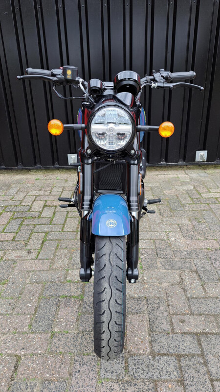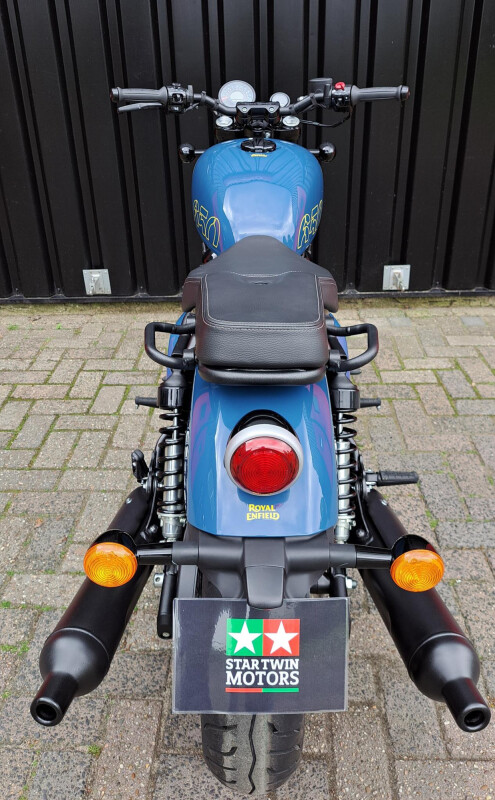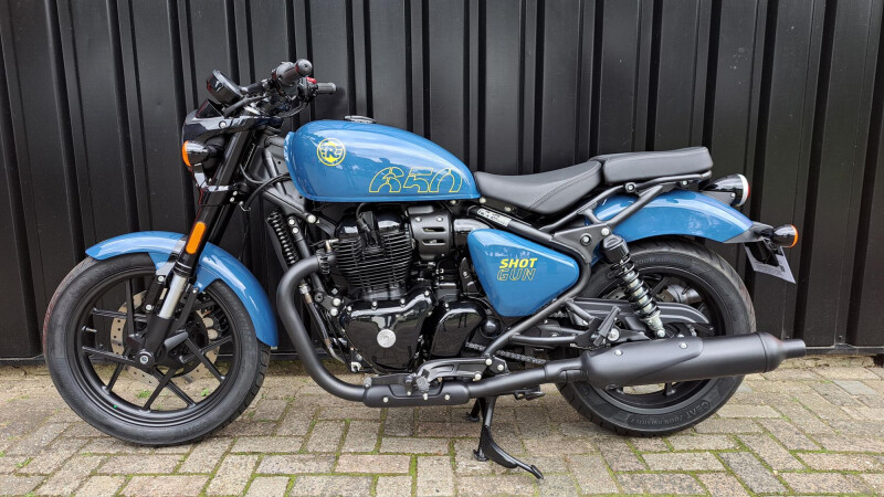 DE nieuwe Royal Enfield Shotgun 650 in de kleur Plasma Blue. Dit betreft een unieke door Custom geinspireerde motorfiets die leverbaar is in meerder kleuren.