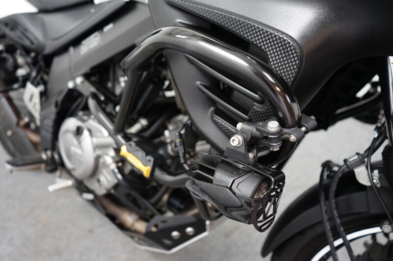 Nette en goed onderhouden Susuki DL 650 V-Strom voorzien van valbeugels met mistlampen, topkoffer met rugkussen, tankpad, LED knipperlichten, middenbok, carterpanbeschermer, opzetruit, standaard verbreder, handkappen en handvatverwarming.
