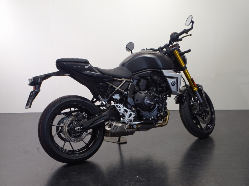 De Suzuki GSX-8T is een opvallende verschijning in het Street-segment. De ronde LED-koplamp, geïnspireerd op Suzuki-motorfietsen uit de jaren 60 en 70, is voorzien van geïntegreerde contourverlichting. Karaktervol design met een moderne twist: de iconische 16,5-liter tank, goudkleurige voorvork en luxe afwerking maken het plaatje compleet: met deze motor val je op.