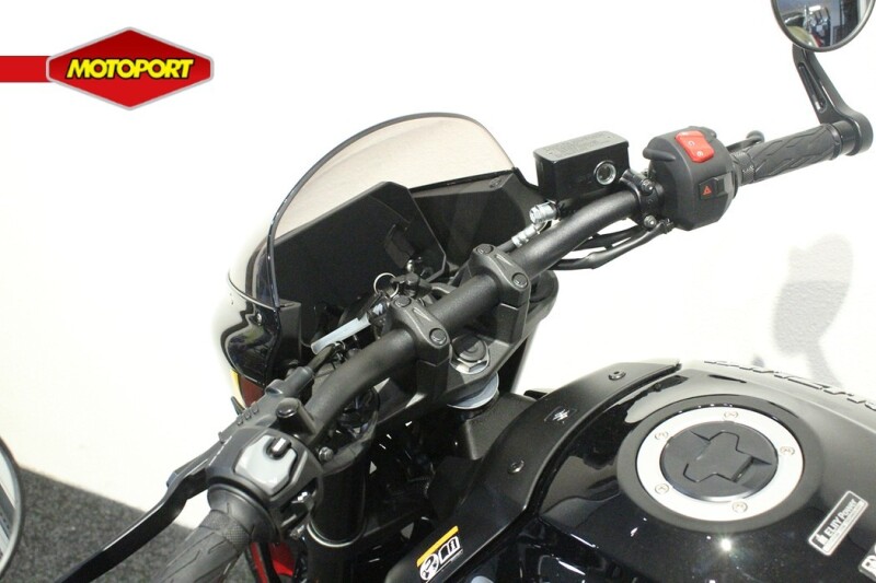 - Korte uitlaat, bar-end spiegels en zadel met rood stiksel