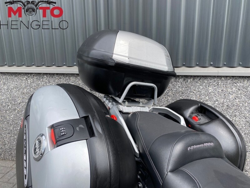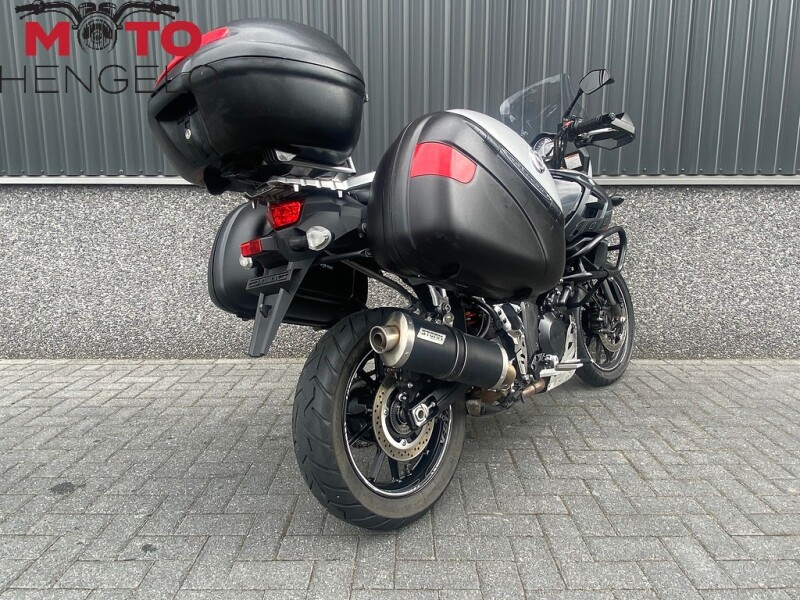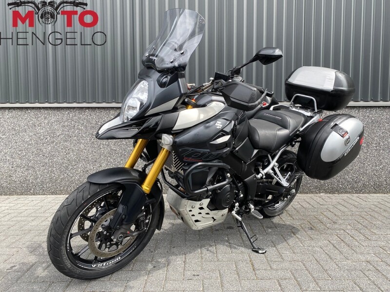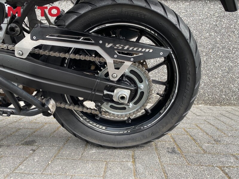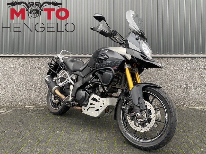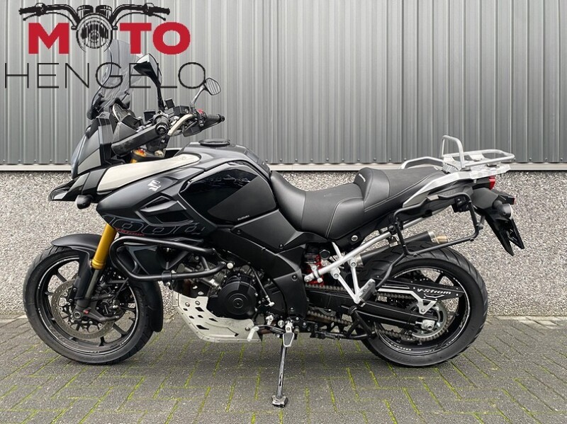 Suzuki V-Strom 1000 met 3-delige kofferset, Storm uitlaat voor het mooie tweecilinder geluid, valbeugels, comfortseat, middenbok, aluminium carterbeschermer, handvatverwarming, SW motech accessoires zoals schakelpook en beschermers en kettingsmeersysteem. Mooie volle tourmachine!
