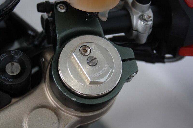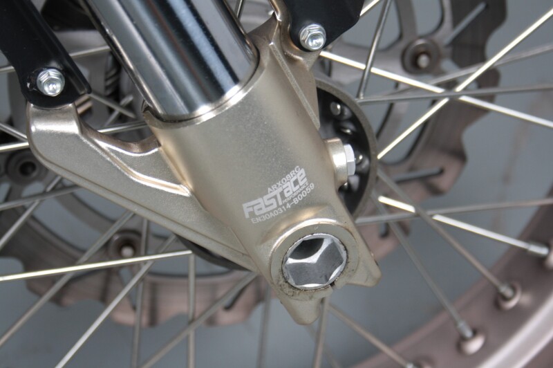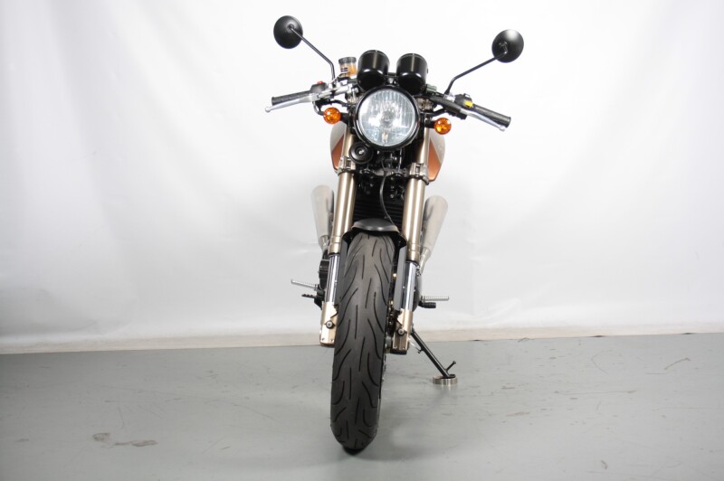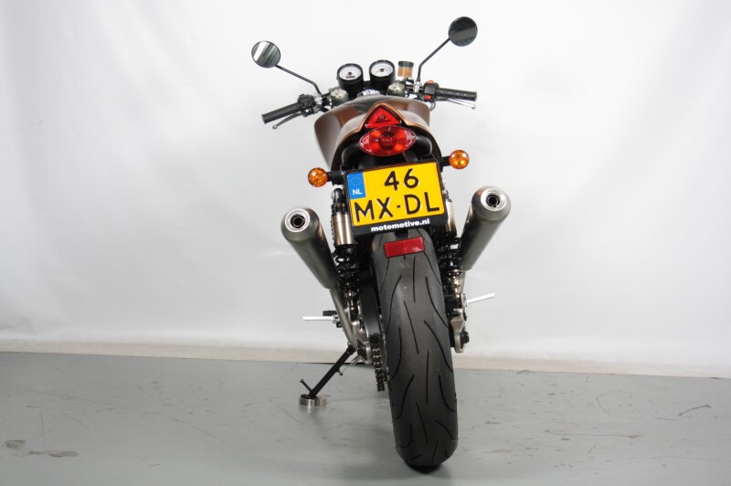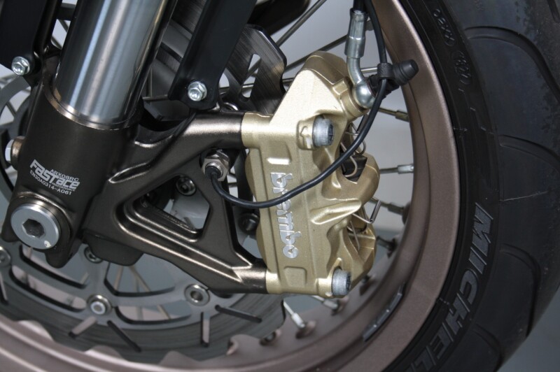 Remmen: Brembo 320 mm voor + 220 mm achter schijven, zonder ABS (later EU-4 modellen hebben wel ABS)