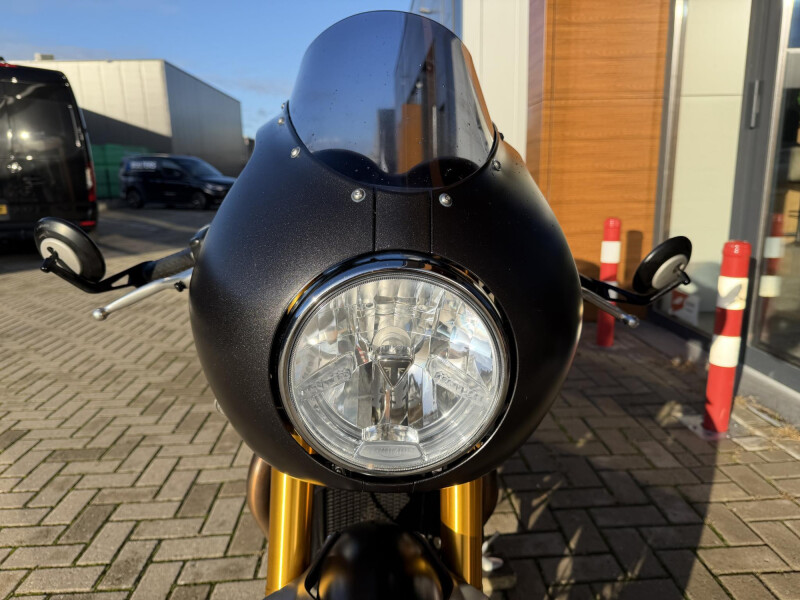 Deze zeldzame Triumph Thruxton RS is origineel Nederlands geleverd en dealeronderhouden. Hij is voorzien van een radiateur bescherming, ohlins vering, topkuip, bar end mirriors en een Vince and Hines uitlaat. verder als nieuw.
