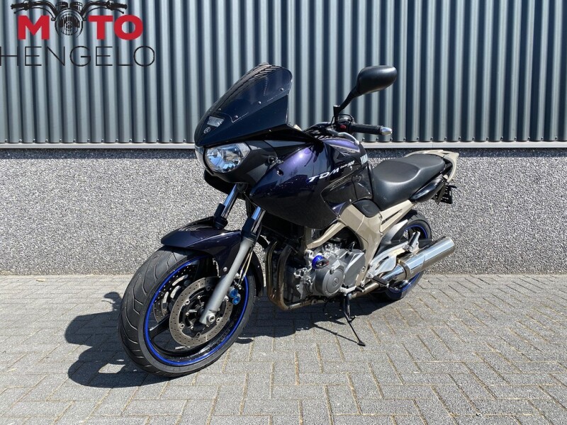 Nette TDM900 met valbescherming, kleine knippers, korte kentekenplaathouder, handvatverwarming, tankring voor tanktas en een donkere ruit.