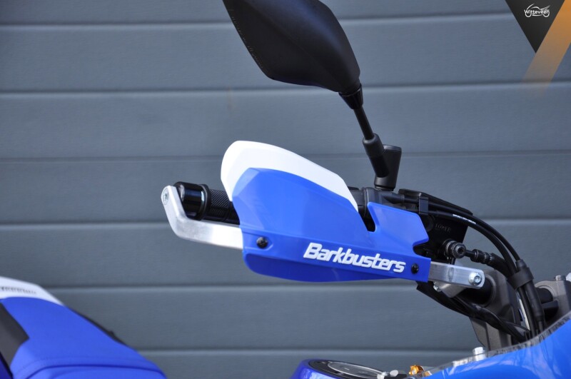 grille, kettingkastje, hoog voorspatbord,. daarnaast handkappen van Barkbuster en een einddemper van Dominator.